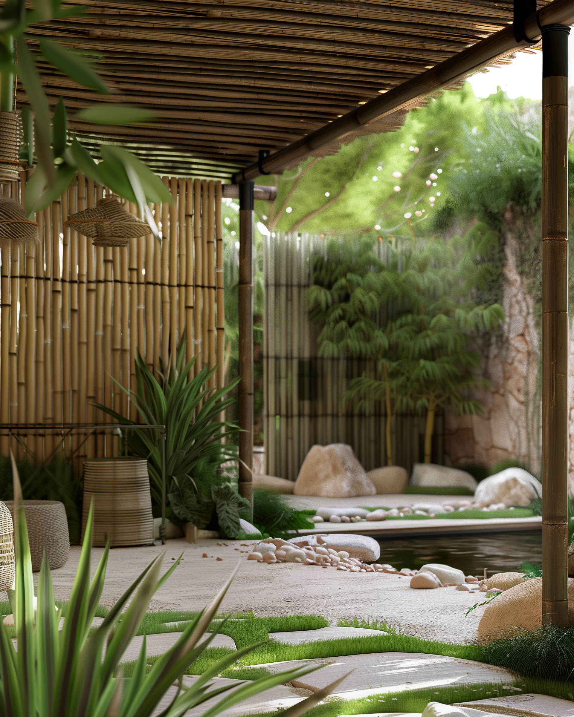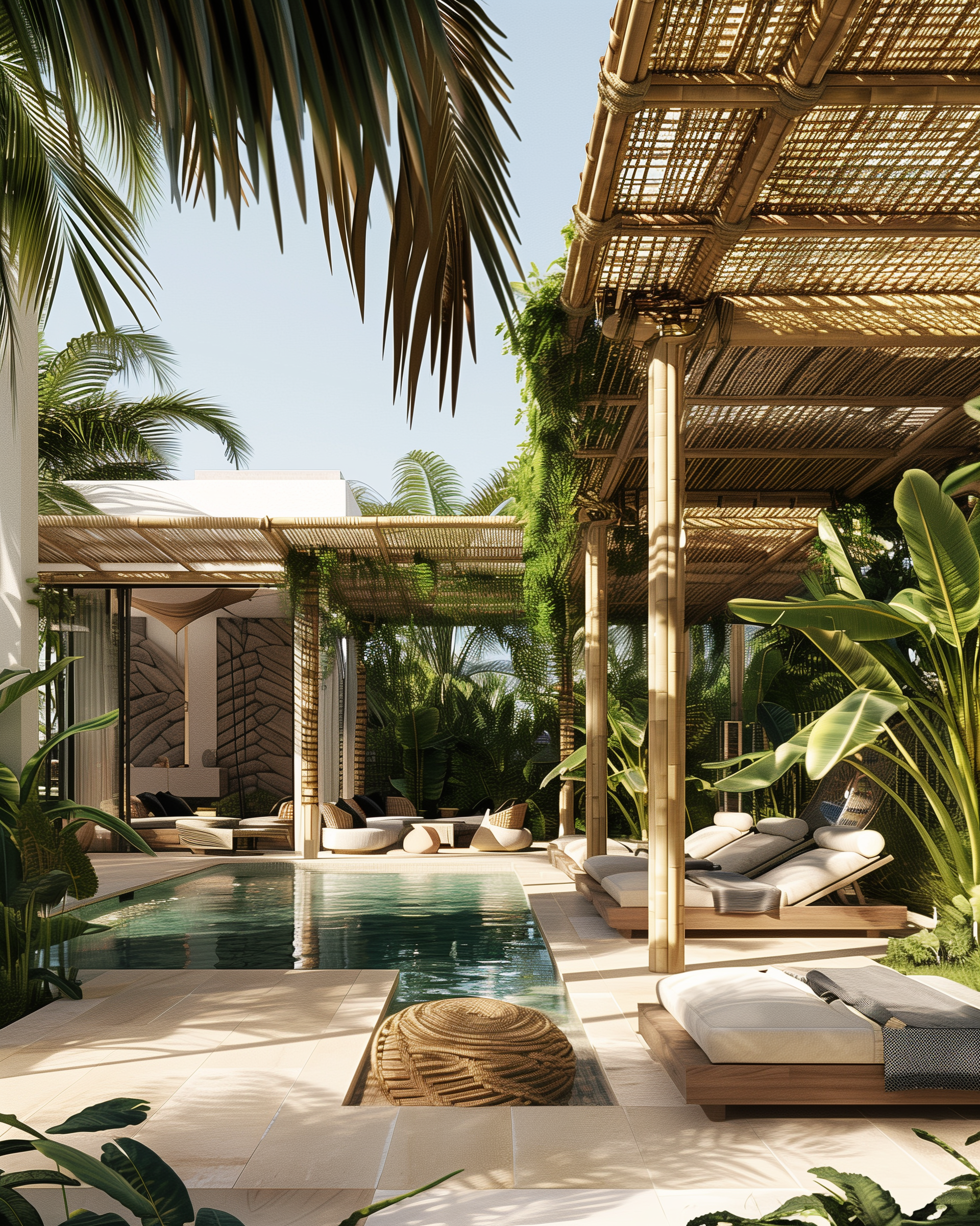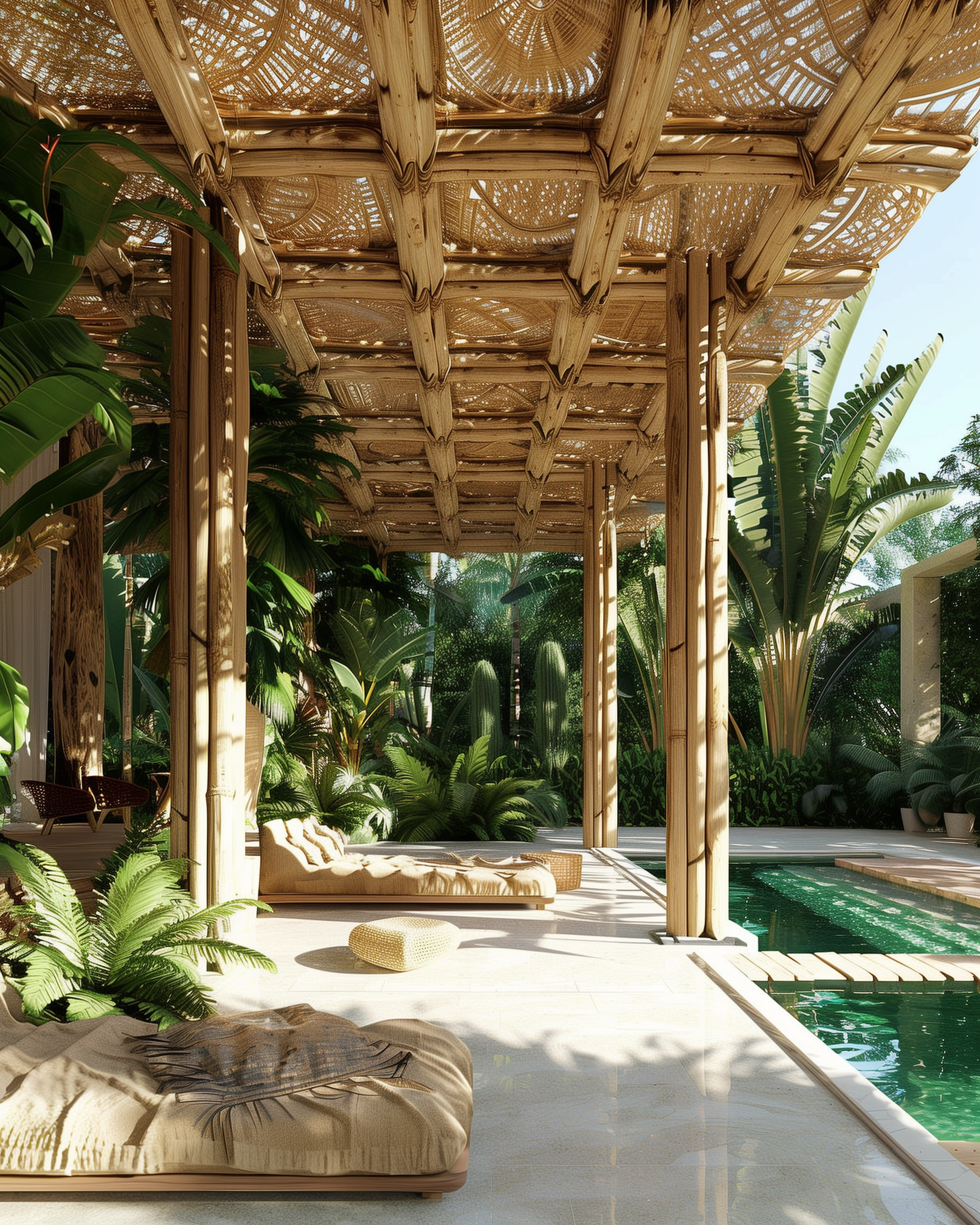 Bamboo is a stylish and eco-friendly choice for bringing a natural, laid-back vibe to the space. Perfect for creating pergolas, chic shade canopies, or stunning accent walls, bamboo adds that tropical touch that fits right into Ibiza’s relaxed yet luxe lifestyle. It’s lightweight but surprisingly strong, making it a great design feature, though it’s not the best for heavy-duty structures unless treated for durability. If you’re after a clean, modern look, bamboo is best as an accent rather than the star. It will do well in conveying tropical or far-eastern design moods.
